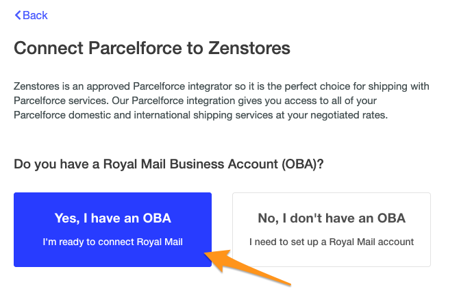 2. You'll be taken to a page to confirm you have a Royal Mail OBA account. Click "Yes, I have an OBA account" to continue.