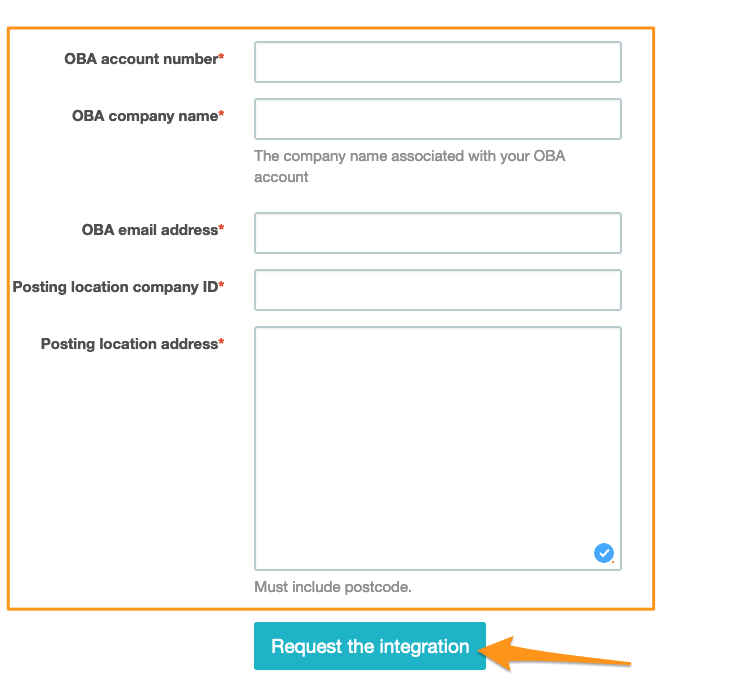 - Posting location company ID — a series of numbers associated with each posting location in your OBA. For help finding this, see our guide: How to find your OBA posting location number and collection postcode.